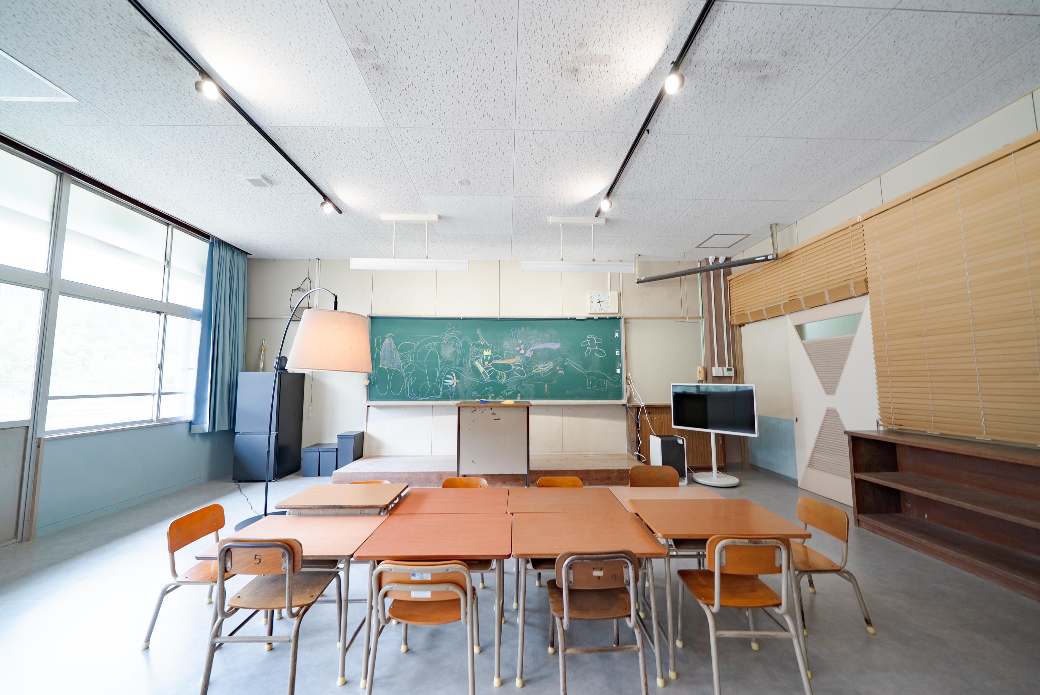 続いて、1年1組のお部屋。教室がほぼそのまま生かされた客室です。家族やグループでの宿泊にピッタリ。