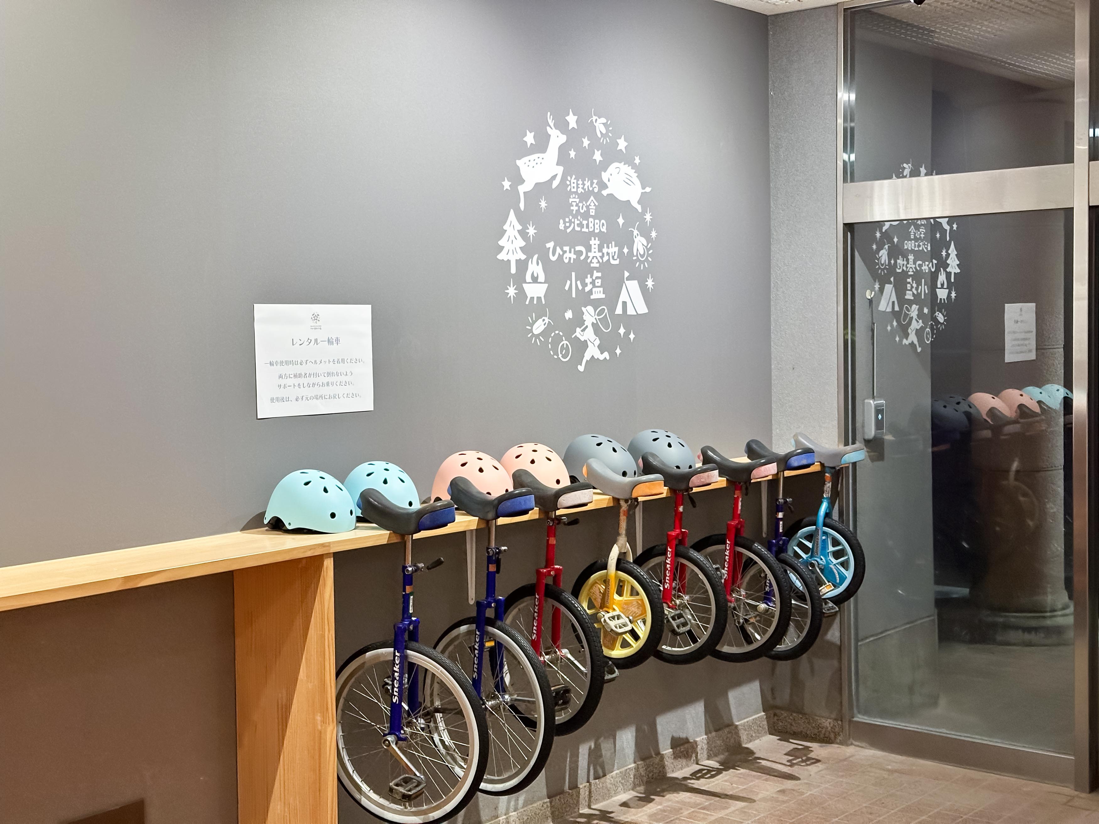 宿泊者には一輪車のレンタルも。この一輪車は廃校になるまで使われていたものです。随所に小学校時代の面影が残り、どこか懐かしい時間が流れています。