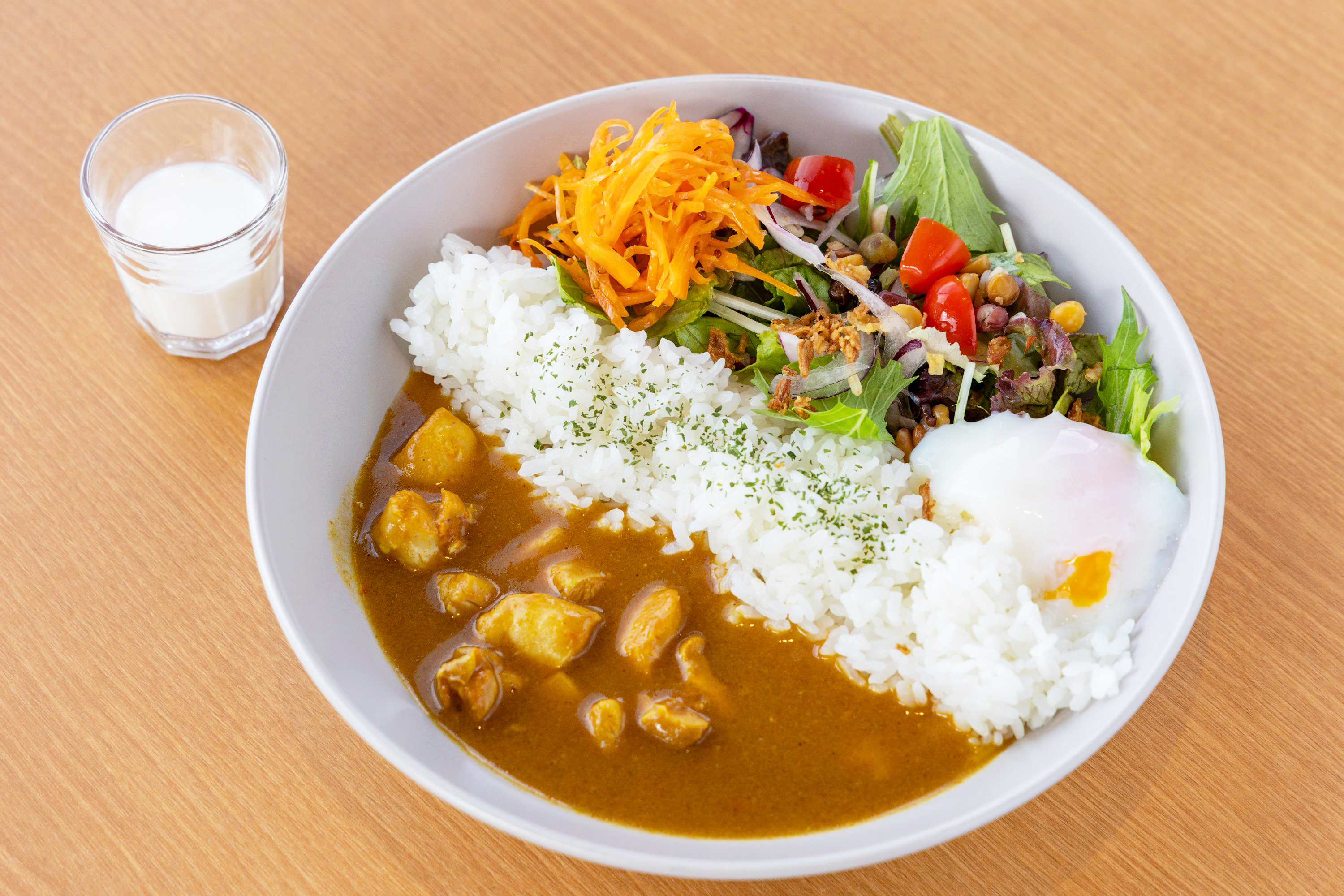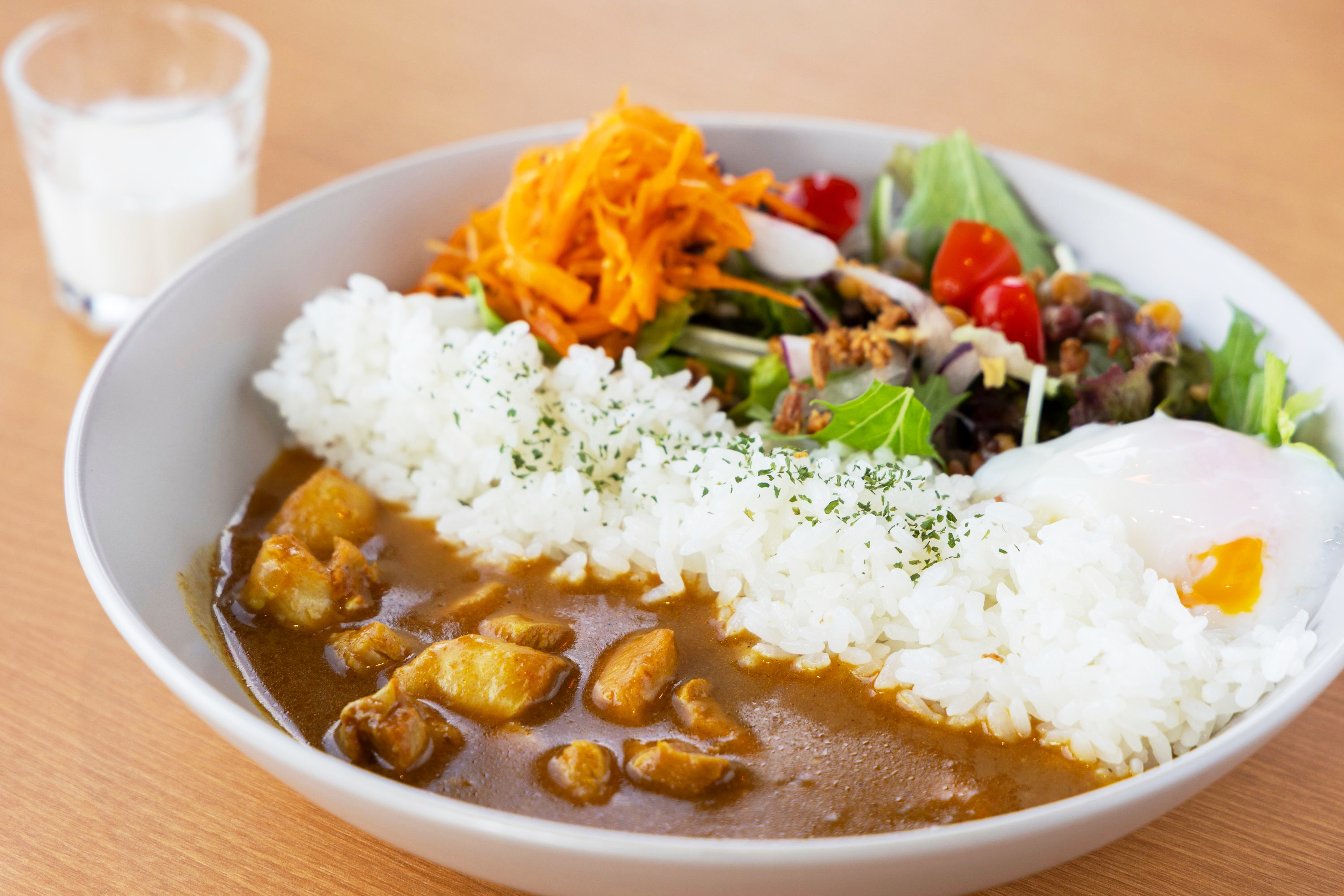 本店「十割蕎麦きふね」の蕎麦出汁をベースにした、本枯れ節が隠し味!蕎麦出汁とスパイスが効いたピリ辛のカレーには、うきは「松野牧場」の飲むヨーグルトがついてきます。カレーにかけても良いし、ラッシーとして飲んでも美味しい!