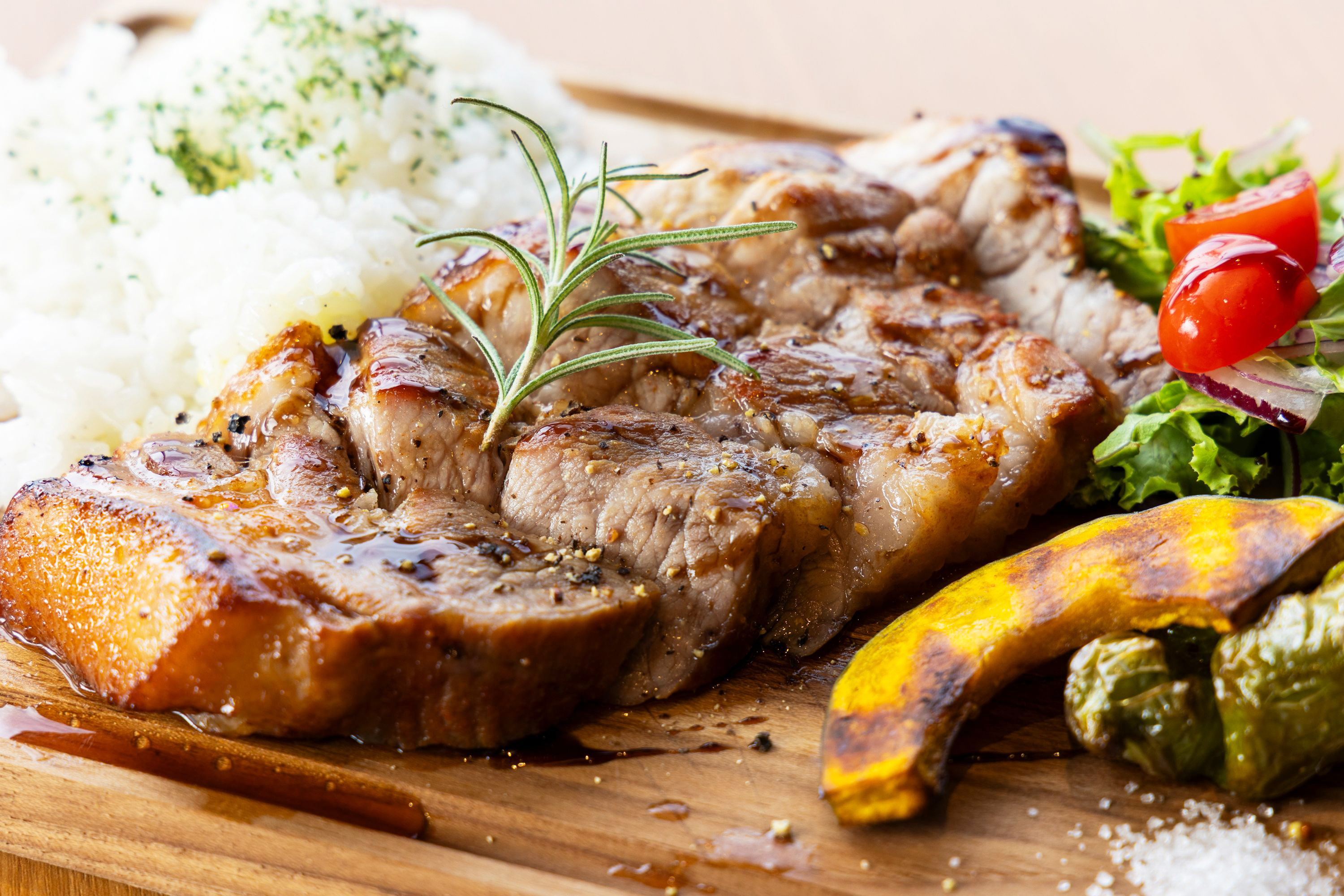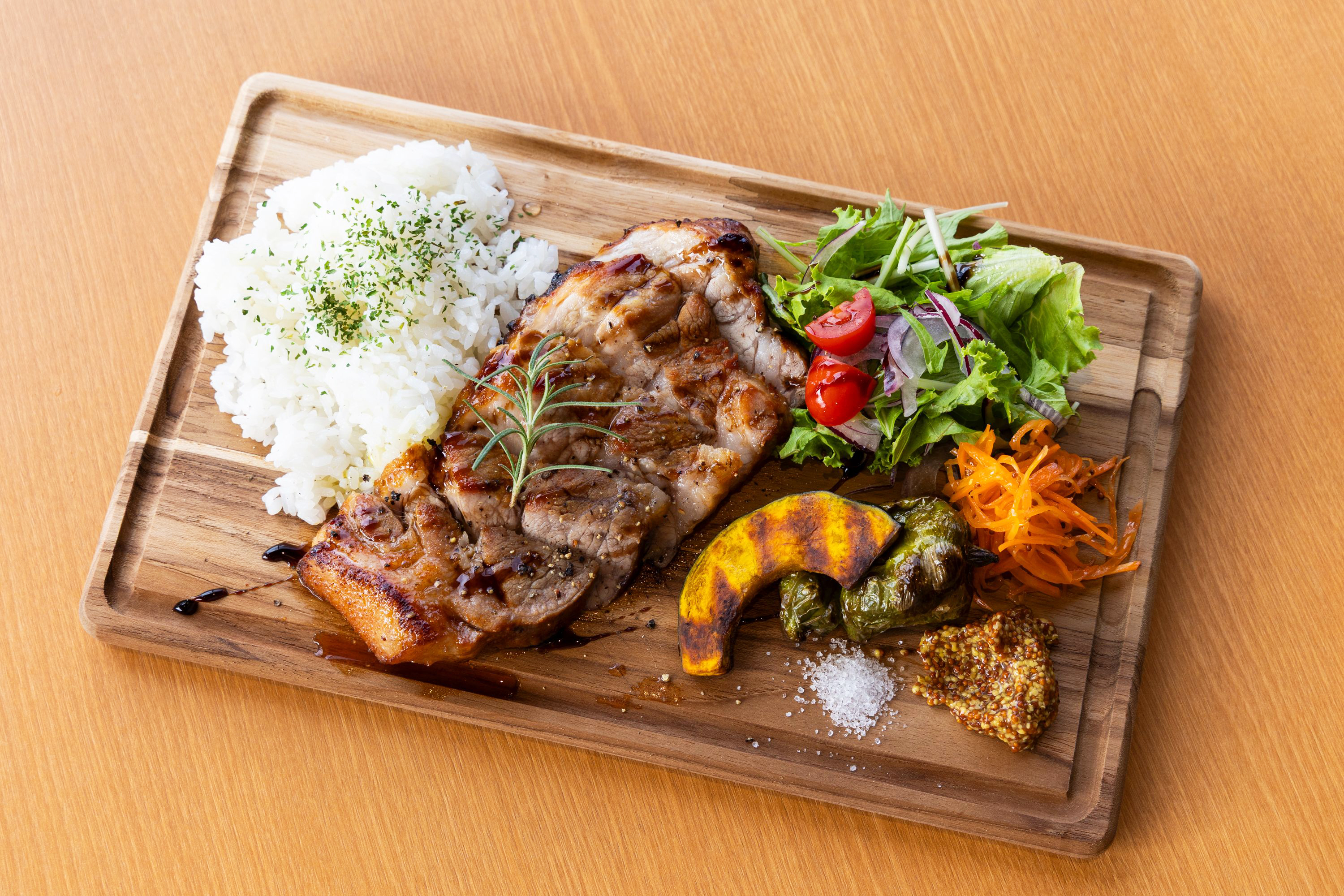 うきはブランドの「耳納豚」の肩ロースで豪快にじっくりと焼き上げます。20~30分程待つ価値あり!ぷりっぷりでジューシーな食感が魅力です。
