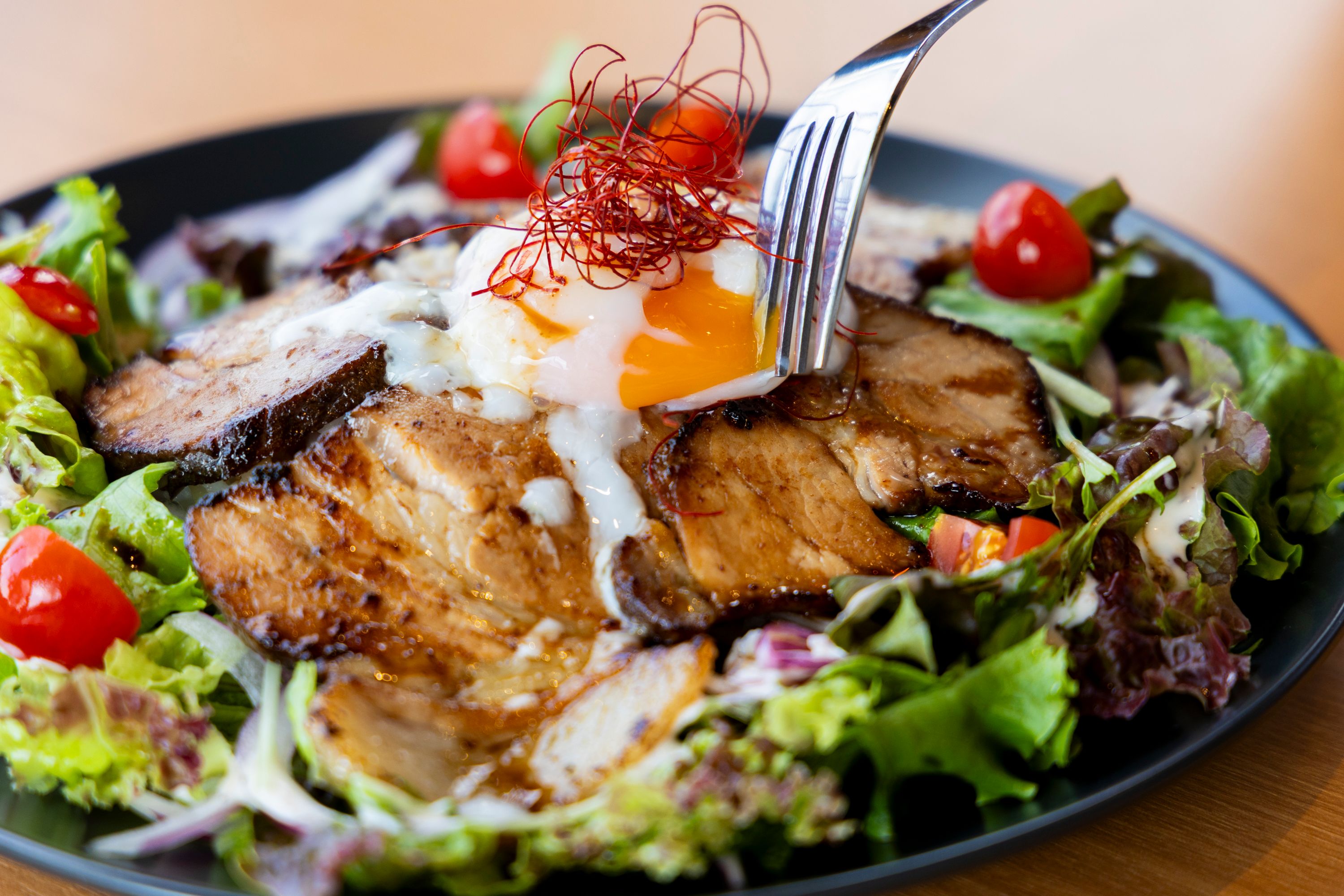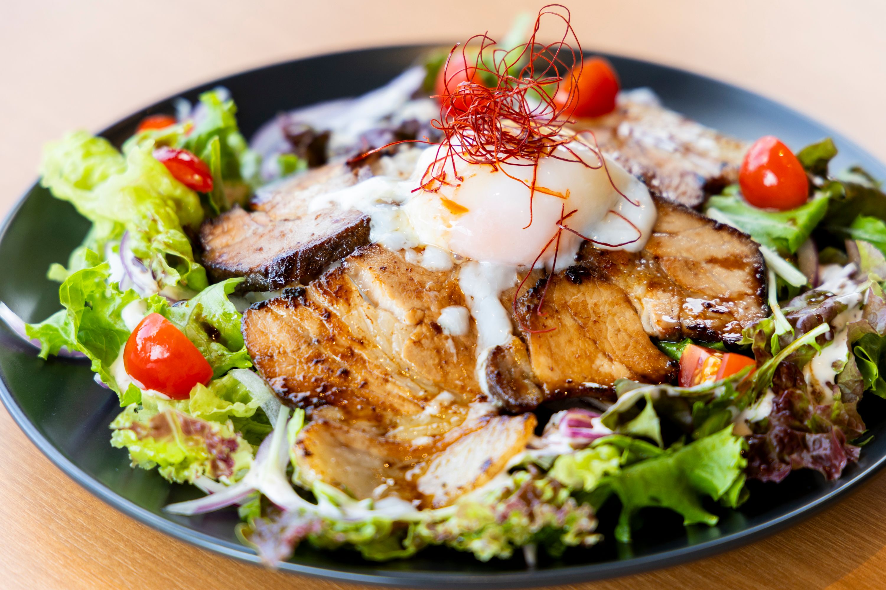 耳納豚の肩ロースをそば屋の“かえし”にじっくり漬け込み、肉厚に仕上げたチャーシューにとろりと崩れる卵とたっぷりのサラダを合わせた、ここでしか味わえない渾身の「ニューローカル飯」です。