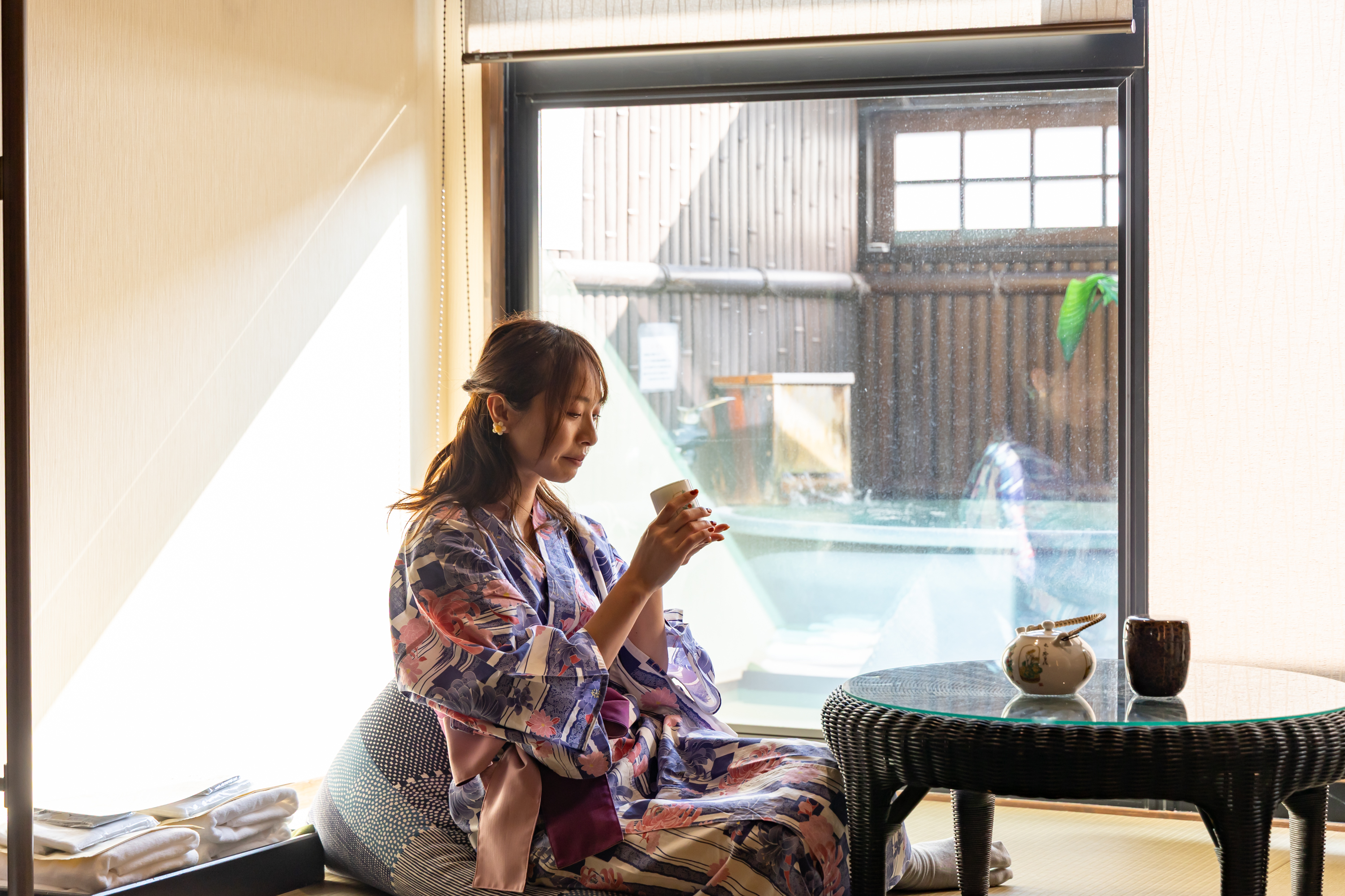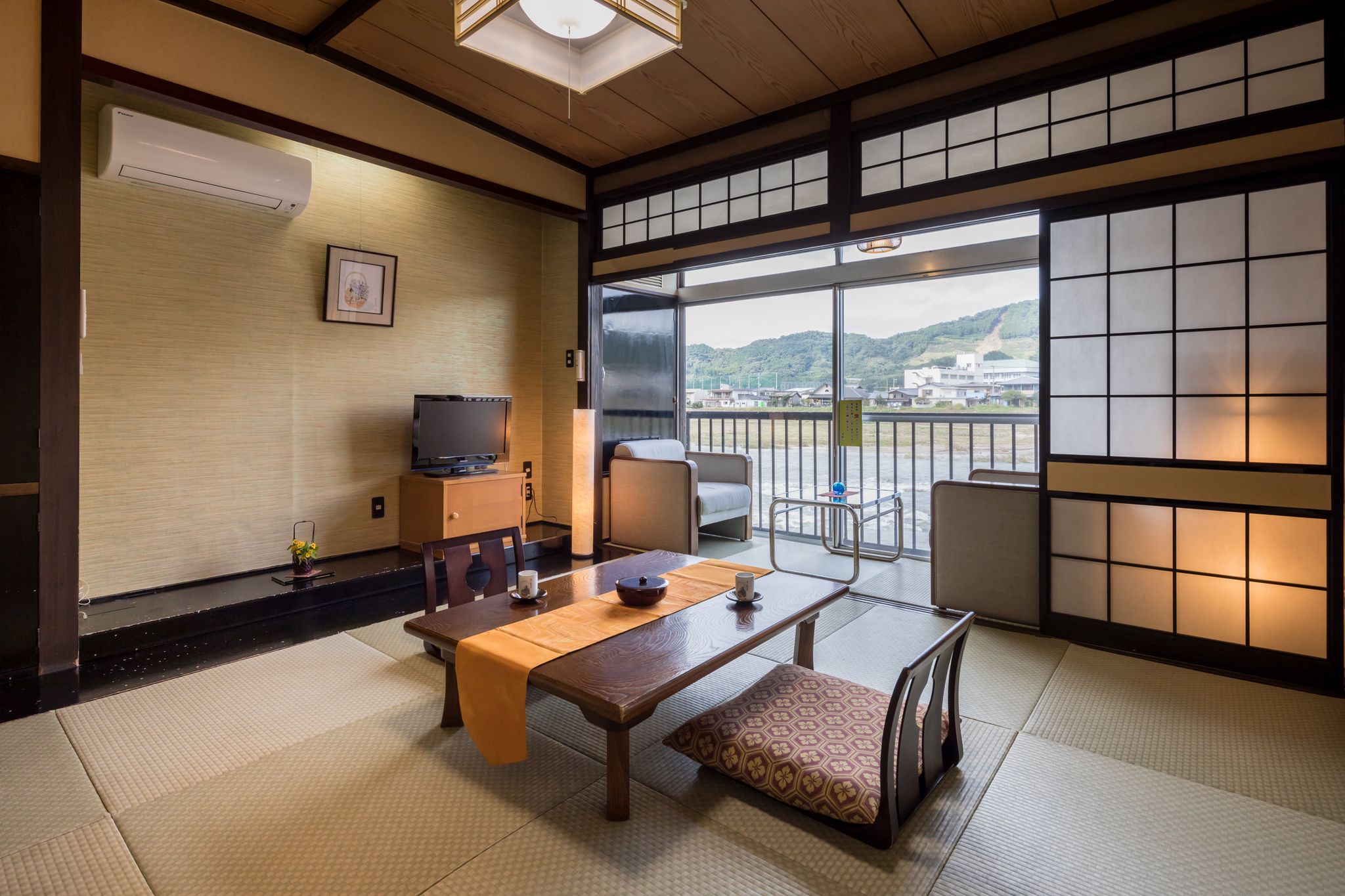 窓の向こうに広がる筑後川や耳納連山の眺めに癒されながら、温泉、会席料理を味わえる至福の宿「桑之屋」。