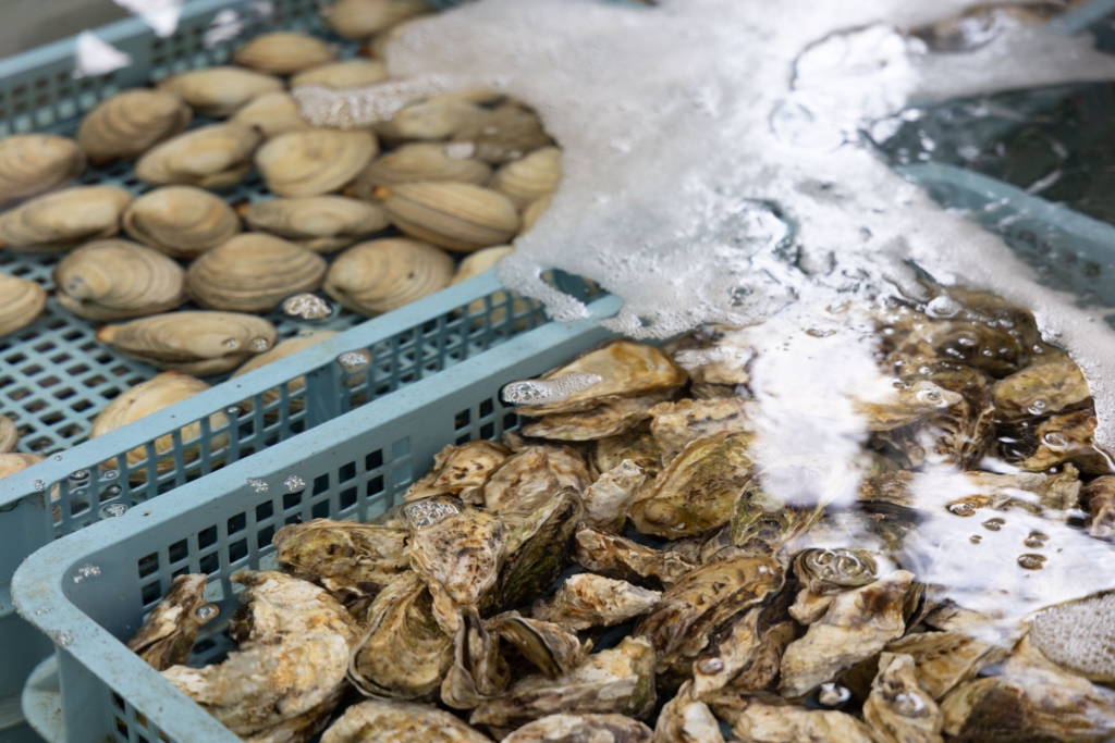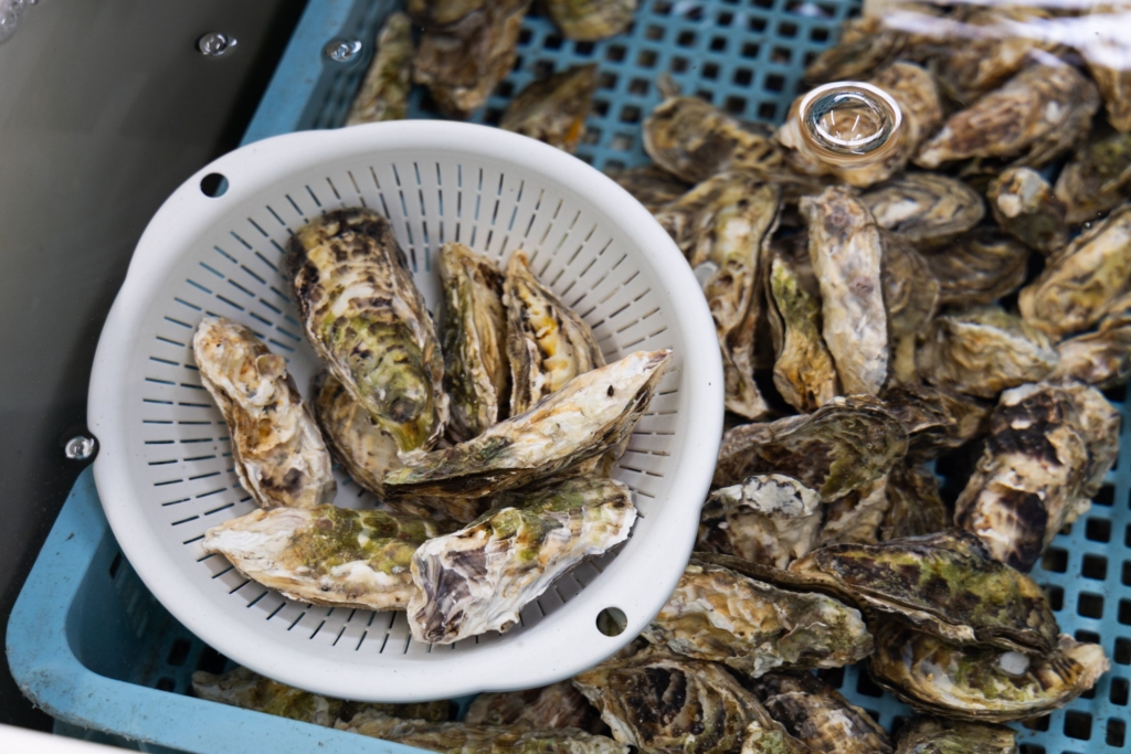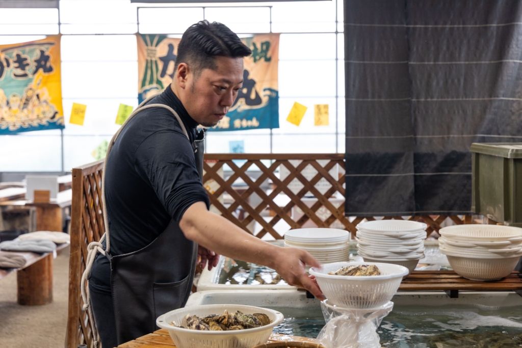 「お客さんには美味しい牡蠣を食べてもらいたいから」と、一つひとつ吟味厳選し、海水ごと運び入れて生け簀で活かす徹底ぶり。