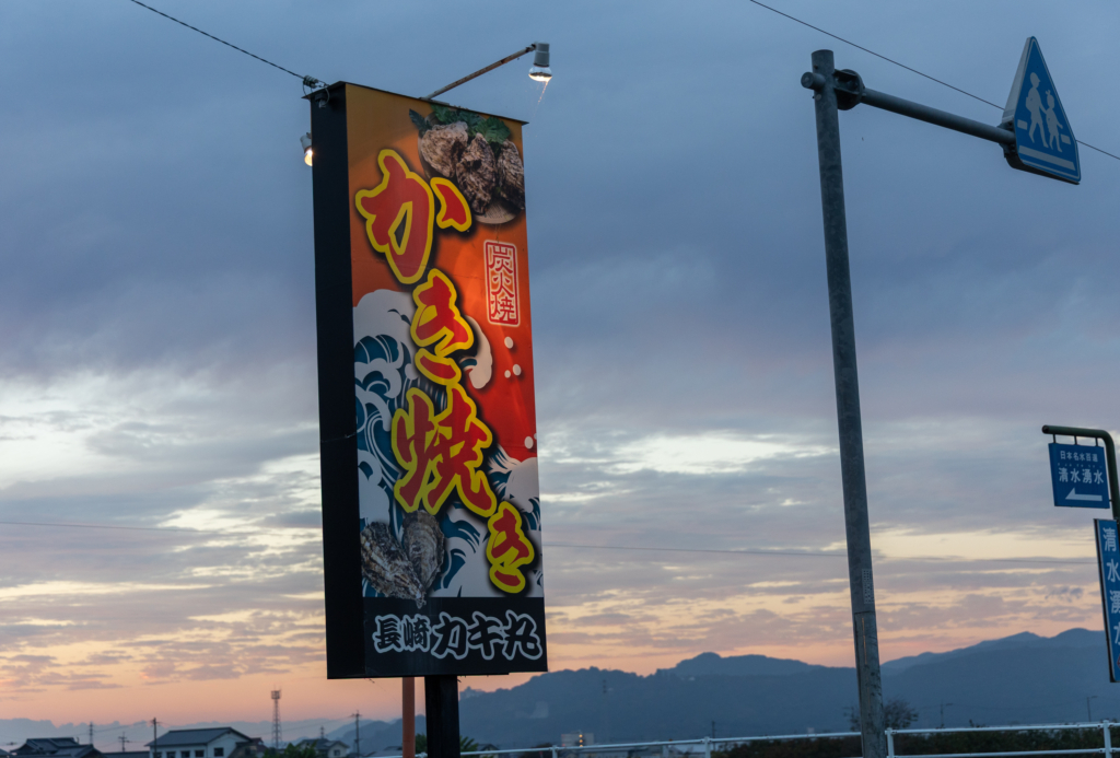 道の駅うきは近く。大きな看板の先には、風にたなびく「カキ焼き」の旗。