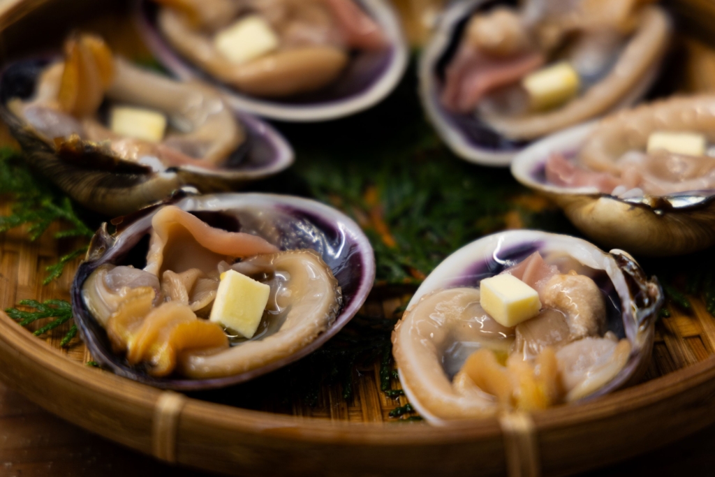 生け簀にはサザエ、片貝ホタテ、特大有頭えび、ハマグリ、アワビ、ひおうぎ貝など、牡蠣以外の海鮮も豊富。