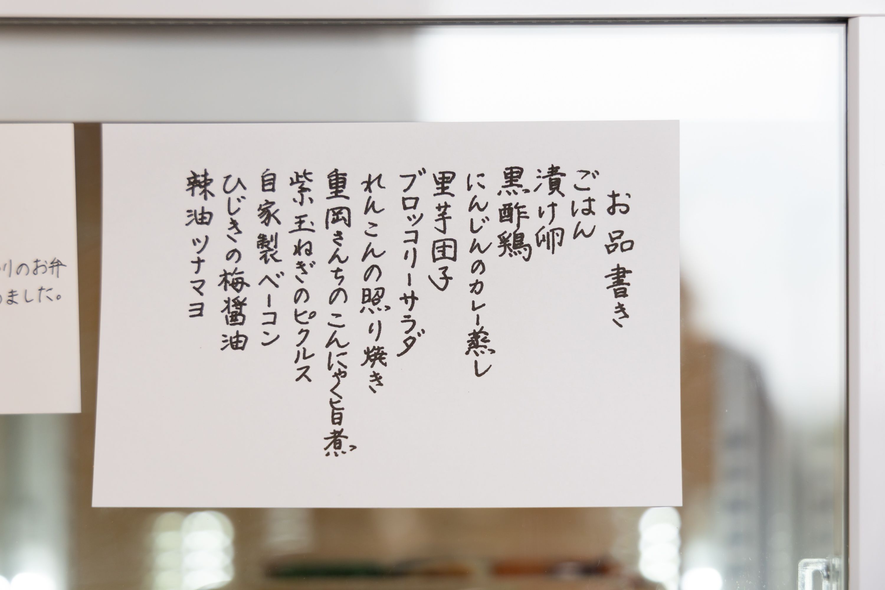 取材の日に販売されていたお弁当のお品書きには、いつも家族のために作っているという自家製ベーコン、辣油であえたツナマヨ、紫玉ねぎのピクルス、れんこんの照り焼き、里芋団子、にんじんのカレー蒸し、ひじきの梅醤油など12種類。