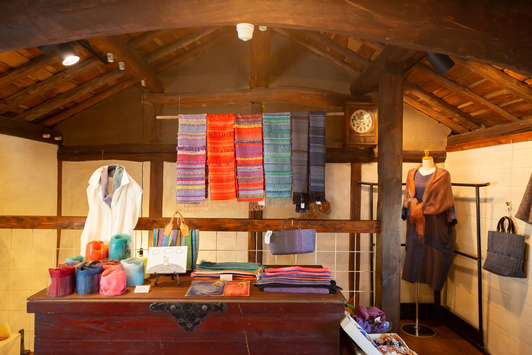夫婦で営む工房では、陶器の器や動物モチーフのオブジェ、天然素材を染めた布小物が並びます。
