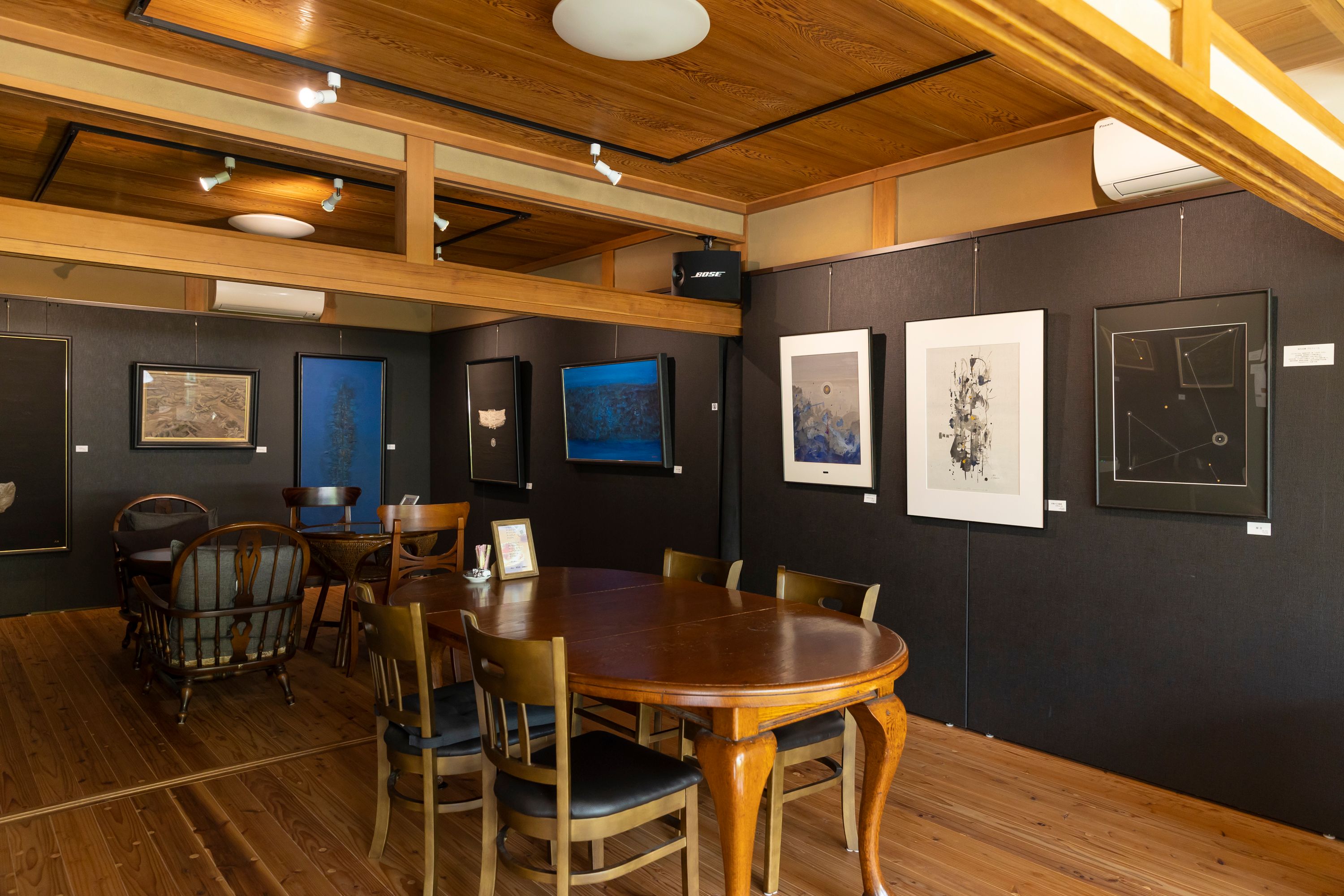 築113年を超える町家を改装した空間で、ギャラリー・宿泊・カフェが一体となった雅な拠点。昼は自家焙煎コーヒーやスイーツを味わい、夜はしっとりと灯る明かりの中で過ごす時間に心がほどけます。何度訪れても新たな魅力を発見できる、静かな佇まいと居心地のよさが魅力です。宿の1階には地元の陶芸家の作品やオーナーがこれまで集めてきた絵などが飾られています。
