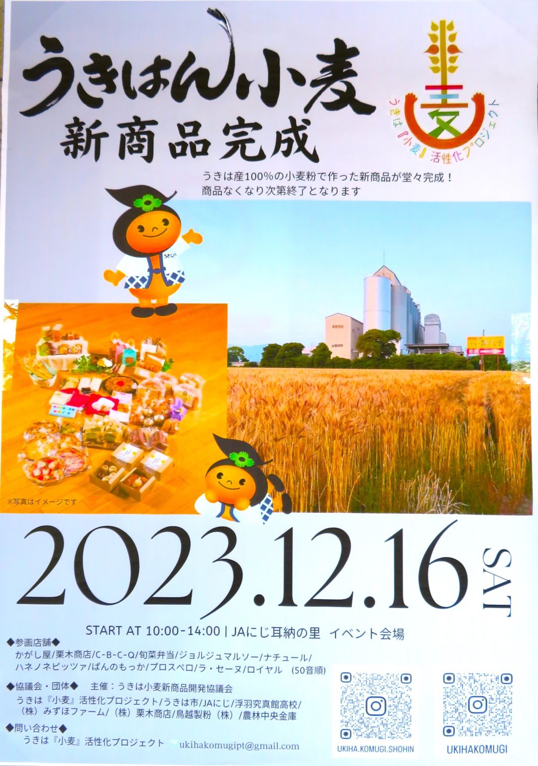 12月16日(土)にじの耳納の里にて、うきは「小麦」活性化プロジェクトの皆さんによりますイベントが開催されます。新商品など販売予定です。また、その日は10:30〜「豚汁無料配布」を行うそうです♪