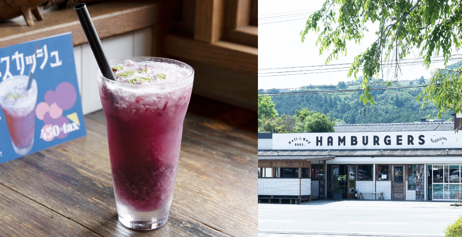 うきは道の駅前にあるボリューミーで肉肉しいハンバーガーが大人気のお店「DeliBoy Bros. Hamburger」にオリジナル「巨峰スカッシュ」が登場。うきは市流川にある「原茂之巨峰園」の美味しい巨峰を皮ごと使用した自家製ドリンクです。すっきりした甘みと皮まで入っているので葡萄の風味が最高!肉肉しい美味しいハンバーガーと合わせてぜひともです!