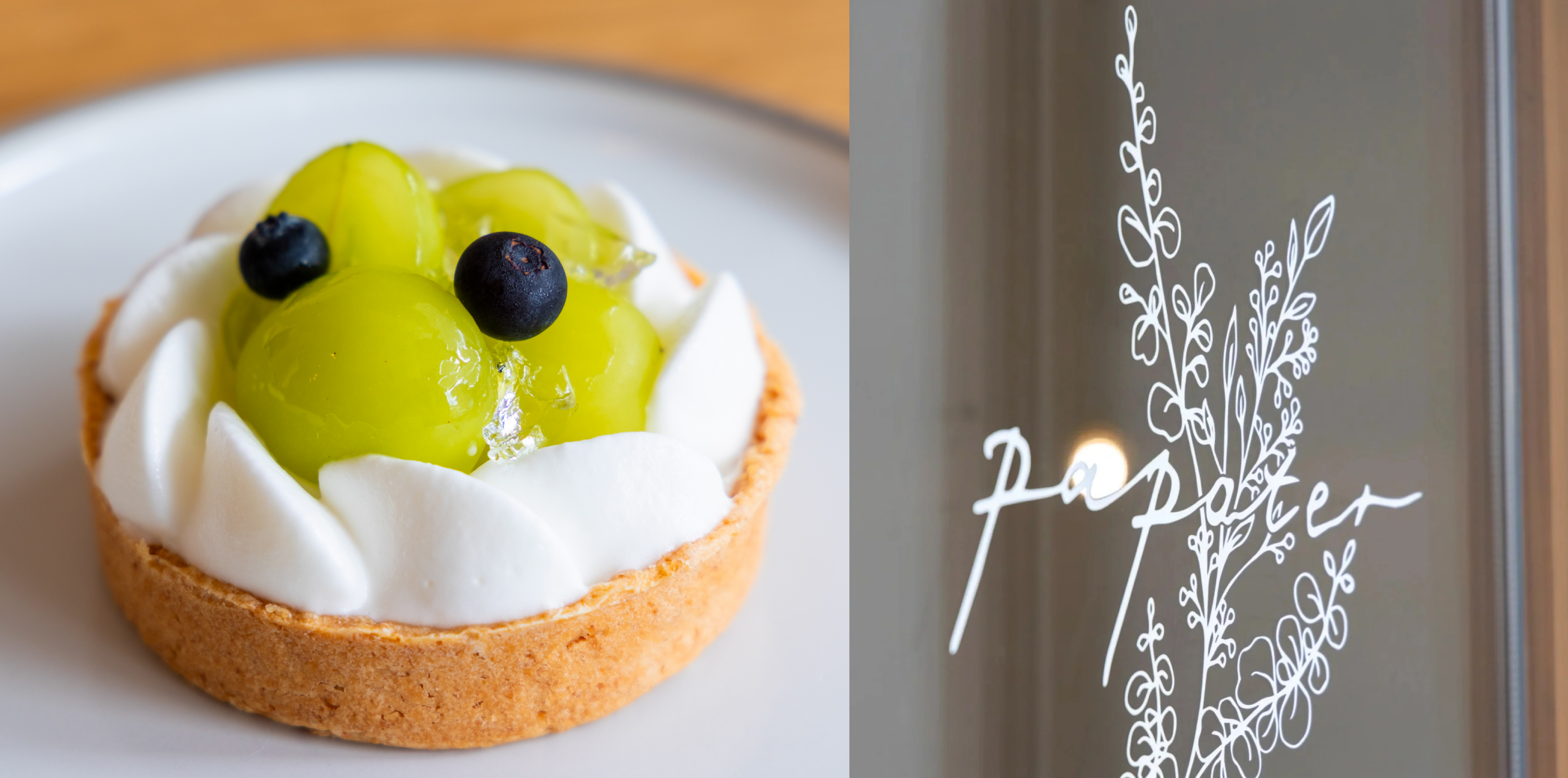 季節のフルーツを使ったケーキや旬のお野菜を使ったキッシュが人気の「papoter」 桃が終わって今はブドウやいちじくを使ったスイーツになりました。店内のみのシャインマスカットのショートケーキもいいですが、テイクアウトもできるシャインマスカットとブルーベリーがのったチーズタルトもおすすめです。中にはブルーベリーソース、上にはフルーツとレモンジュレ、クリーミーでさっぱりなチーズクリームとタルトがバランス良くてとっても美味しい!手土産にも喜ばれること間違いなしの可愛らしいスイーツです。