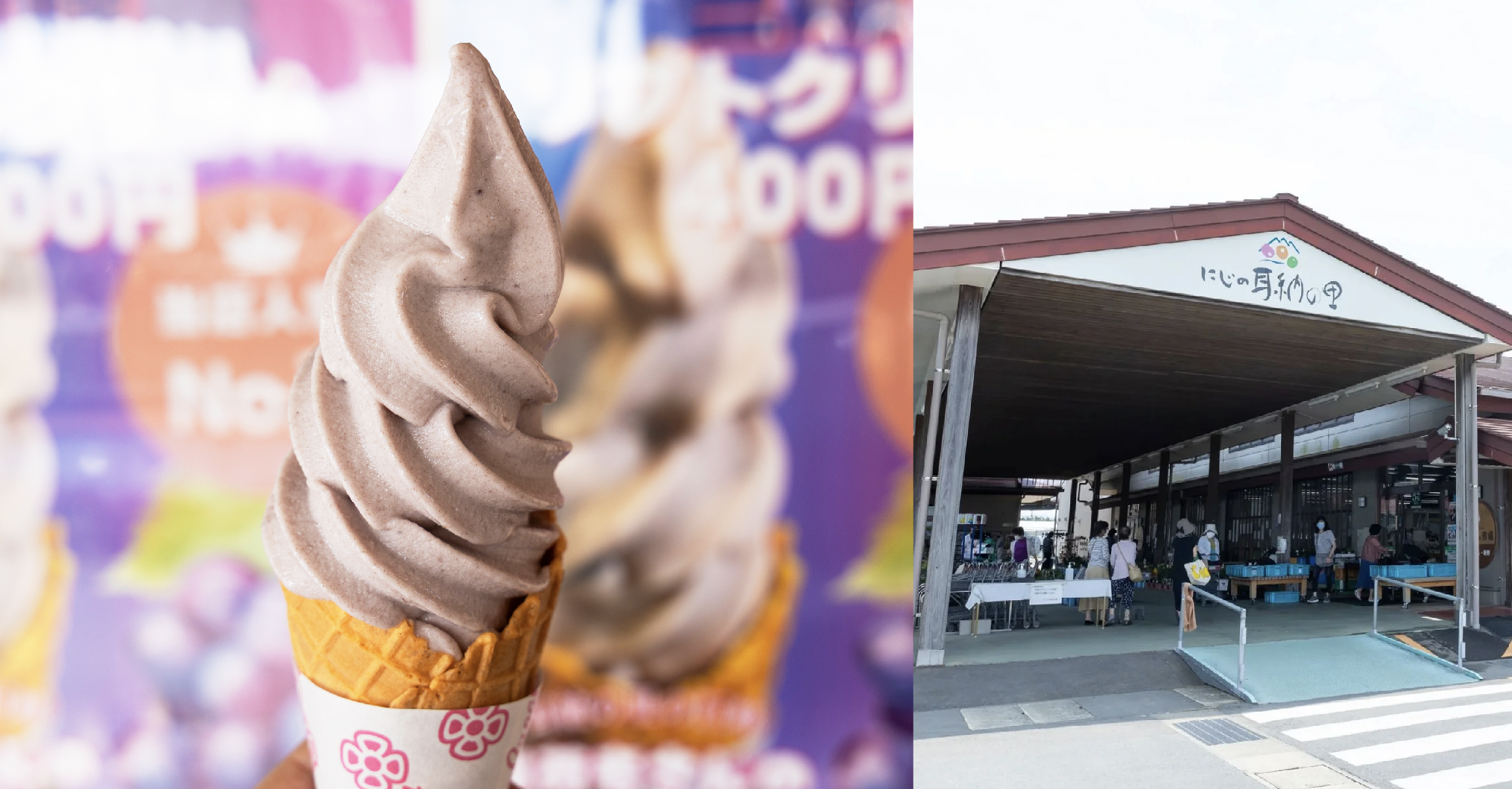 地元の新鮮な果物や野菜が買えると大人気の「JAにじの耳納の里」。その一角にある「アイス工房」ではうきはの葡萄を使った新作「葡萄ソフトクリーム」が発売開始しました!さっぱりとした甘味で、まだまだ暑い日が続く今にぴったりです。松野牧場の濃厚な生乳ソフトクリームとのミックスもおすすめです。10月中旬ごろには新しいフレーバーなる予定ですので気になる方はお早めに~