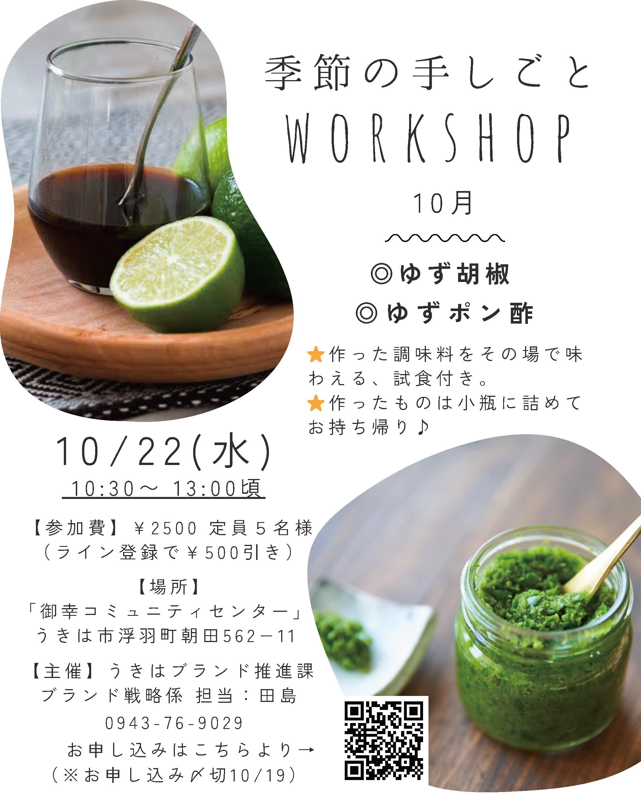 秋の香りを楽しみながら、旬の柚子を使って手づくりの「柚子ごしょう」と「柚子ポン酢」を仕込むワークショップです。旬の香り豊かな青柚子や唐辛子、塩・醤油・お酢といった身近な材料を使い、ご家庭でも使いやすい調味料を一緒に作ります。出来上がった柚子ごしょうとポン酢はお持ち帰りいただけます。体験のあとは、作った調味料を使って、地元豆腐や温かいだご汁などの試食付き。「地元うきはの食材で楽しむ季節の手しごと」をテーマに、秋を感じる手しごとを一緒に楽しみませんか?