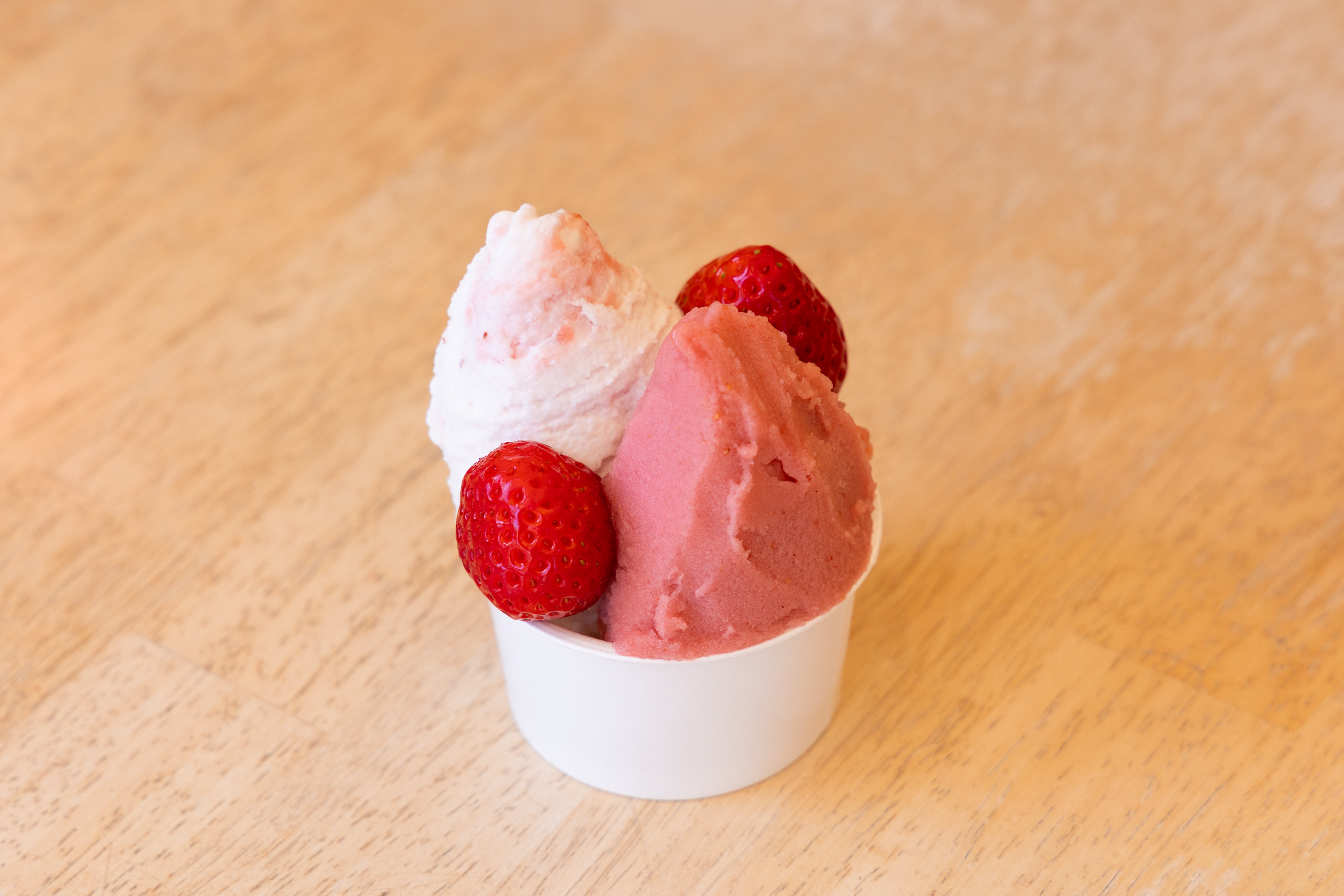 ミネラル豊富な土壌づくりを心掛けているという果樹農園が運営する大人気のジェラート屋さん。2年前から苺の生産もはじめ現在では自社のうきは産苺を使用。そしてなんといちごのアイスを頼むと生の苺をトッピングしてもらえます!苺の甘味酸味がそのまま味わえるいちごソルベは時期によってあまおうか紅ほっぺを使用していていてピンクの色合いがとても美しいです。もう一つのいちごミルクはクリーミーでリッチなミルクと苺の風味が相性抜群。両方ぜひ味わっていただきたい心踊るジェラートです。
