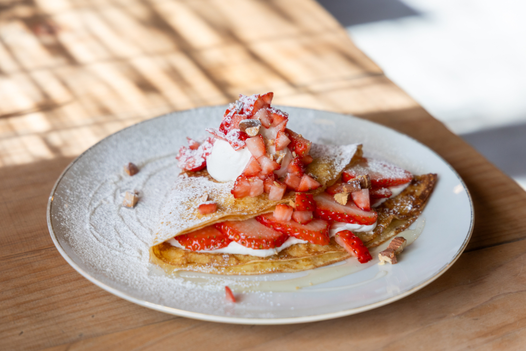 ほっとする旅人カフェでいちごのクレープはいかがですか。もちっと香ばしいクレープにたっぷりの地元産のいちごが入っていて、はちみつとクリーム、ちらしてあるナッツがいい感じです。天気のいい日は日差しの入る窓際席でぽかぽか日向ぼっこしながらゆっくりまったりティータイムを。