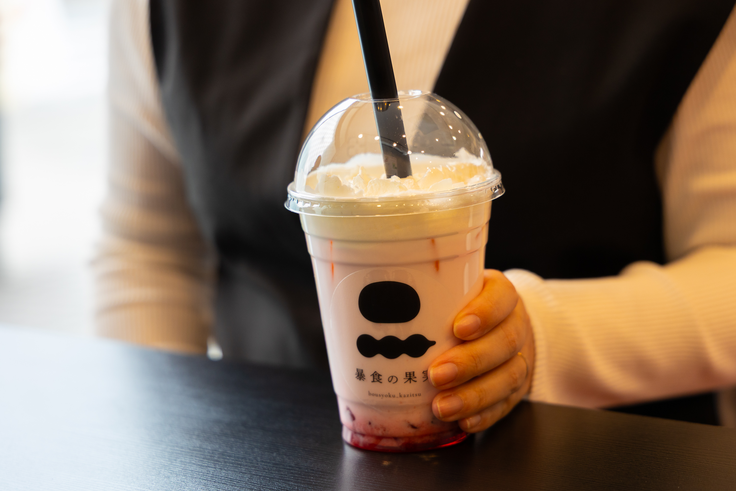 うきはで長年親しまれている「石橋餅加工所」のご夫婦が営まれている創作和菓子のお店「暴食の果実」毎年大人気の「いちご大福」苺の種類はあまおうと日によって変わる品種の2種類があり、それぞれ粒あん、よもぎ、白あん、チョコレートと4種類の味で楽しめます。餅屋さんならではのもち米を蒸し杵で衝き上げた正真正銘の杵搗き餅で、もち米本来の旨みとコシのある歯ごたえの大福餅が甘酸っぱいいちごとあんと合います。糸を引いて半分にすると苺の香りがふわっと香り、一口頬張るとあ〜幸せ。可愛い苺ののった団子もわらび餅ドリンクもおすすめです!