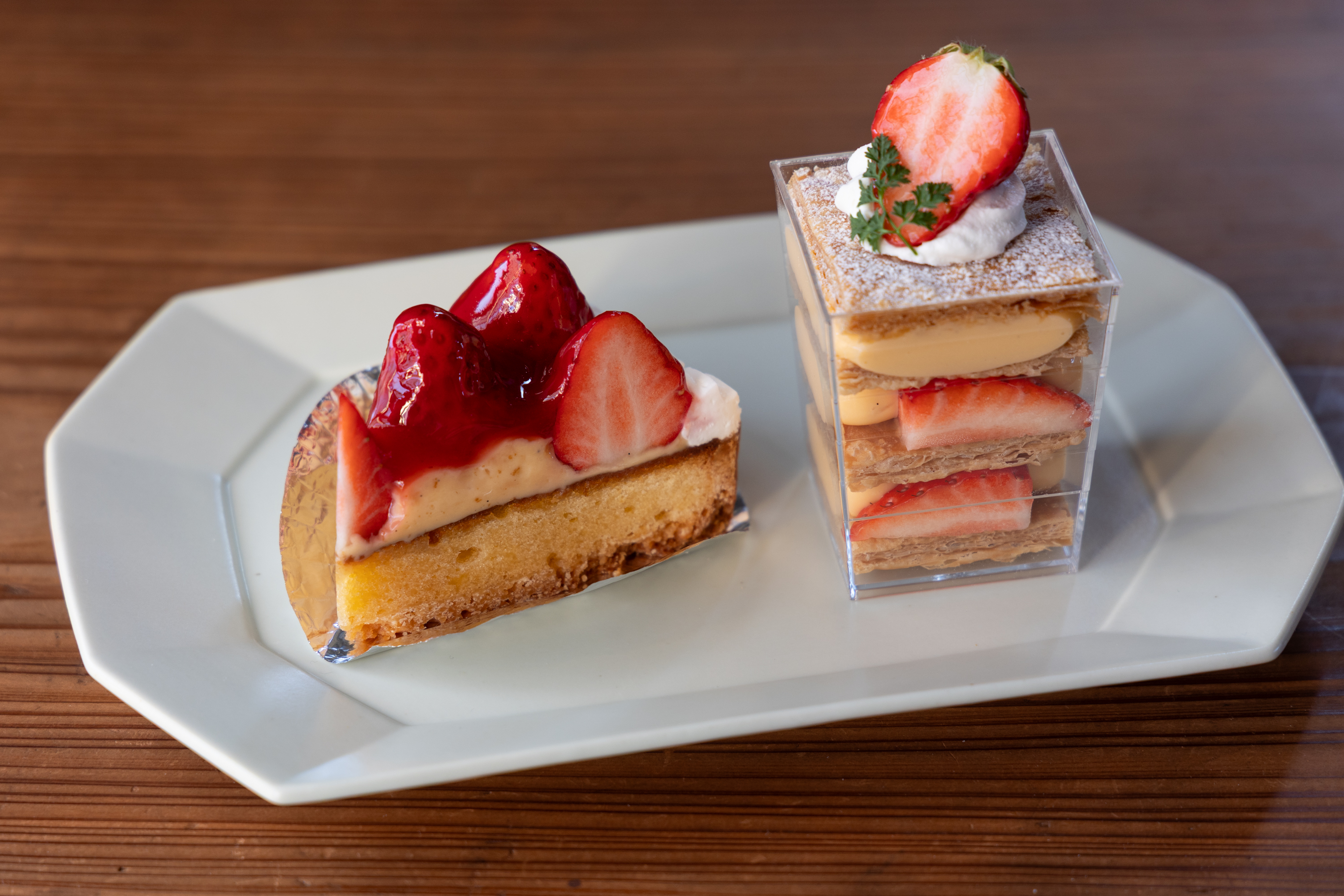 papoter(パポテ)からは、贅沢に旬の苺を楽しめる可愛らしいスイーツが登場♪手前は甘酸っぱい苺とチョコが重なる「イチゴのショコラタルト」。奥は、苺ソース・カスタード・バタークリームを重ねた「苺のカップフレジェ」。冬にぴったりの苺好きにはたまらないスイーツです♪