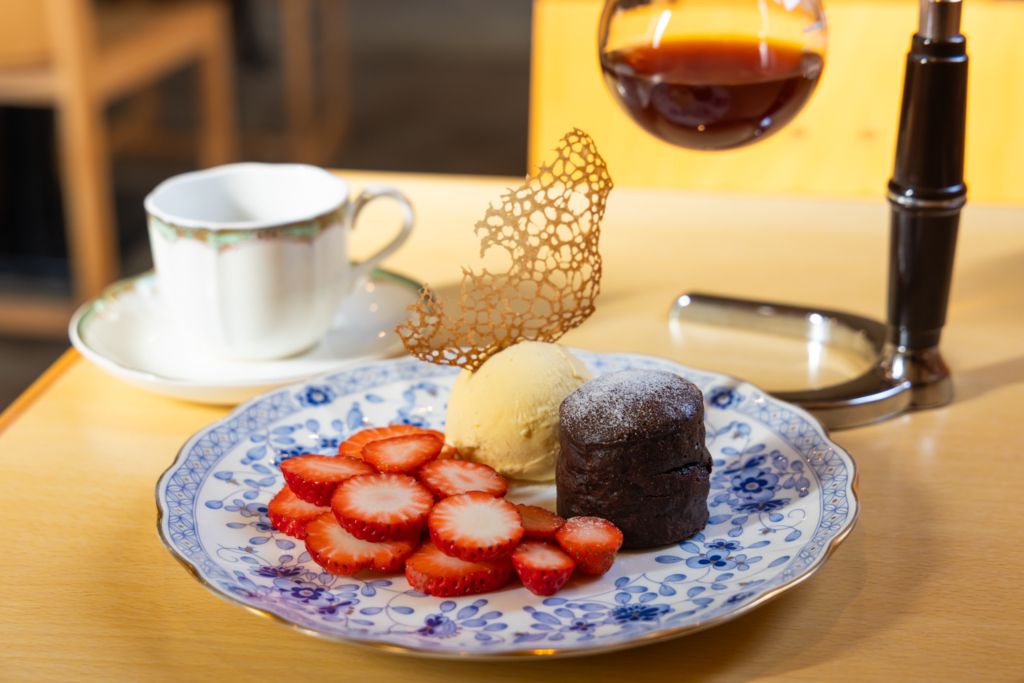 吉井の白壁通りからちょっと離れた住宅街にある隠れ家レストラン。14時からのカフェタイムに苺のフォンダンショコラが登場。熱々に焼き上げられたフォンダンショコラと冷たいバニラアイスに甘酸っぱいいちごのコントラストが最高の一皿です。スプーンを入れると中からとろ~り濃厚ショコラがでてきた時の嬉しさたるや。一口一口幸福感に満たされます。サイフォンでいれたコーヒーとの相性もばっちり。ゆったり甘いスイーツタイムをどうぞ。