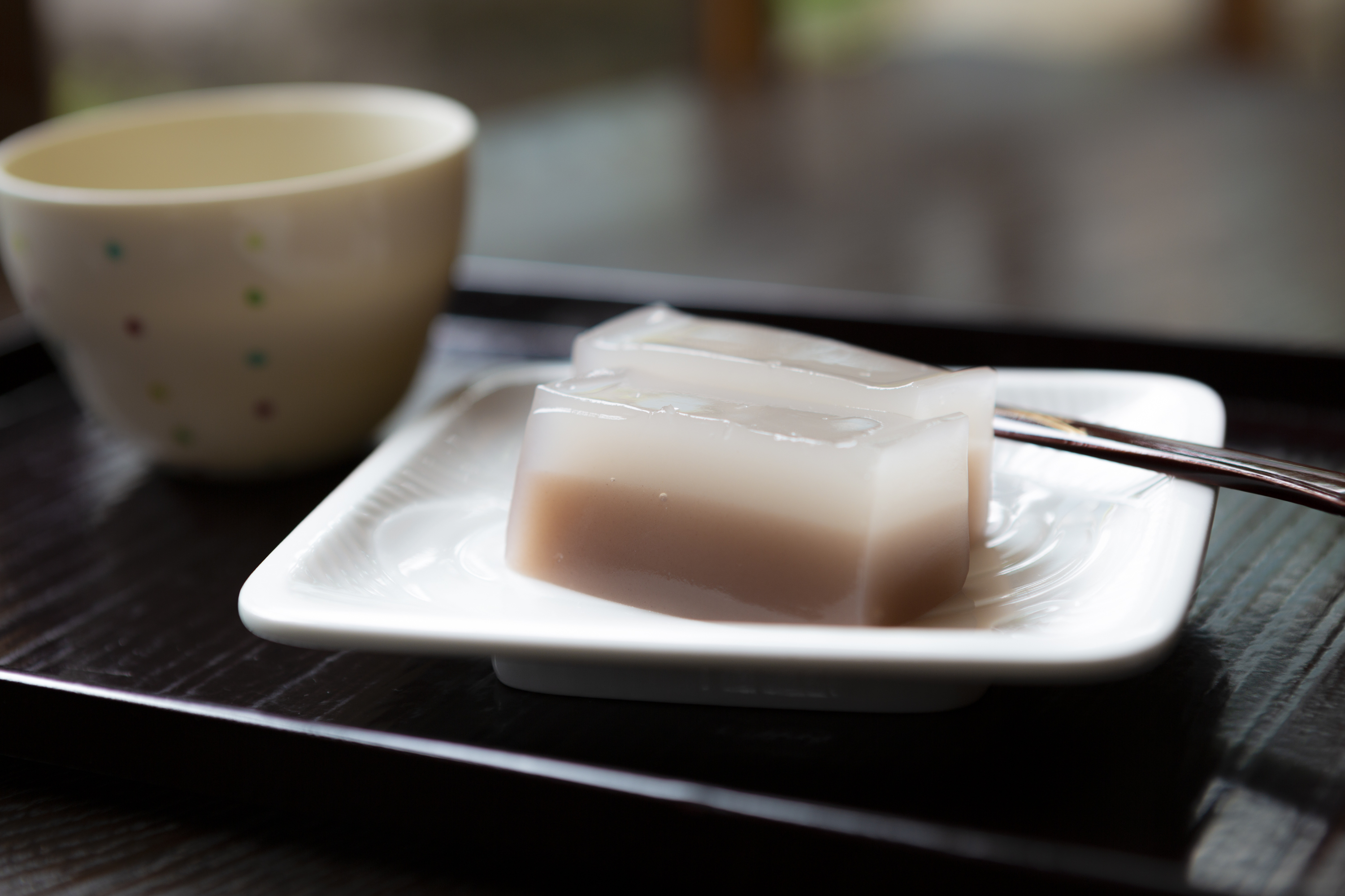 老舗和菓子店・ひた屋福富の名物。白と茶色の二層が美しい葛羊羹は、ぷるんとした食感と上品な甘さが特徴。付属の小さなナイフで好きな厚さにカットして楽しめます。