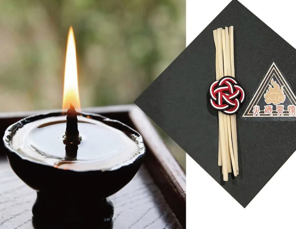 器に櫨蝋を流し込んで作る櫨キャンドルと、和ろうそくに使われる灯芯草で「火除けの御守り」を作ります。灯心引きの実演も行います。