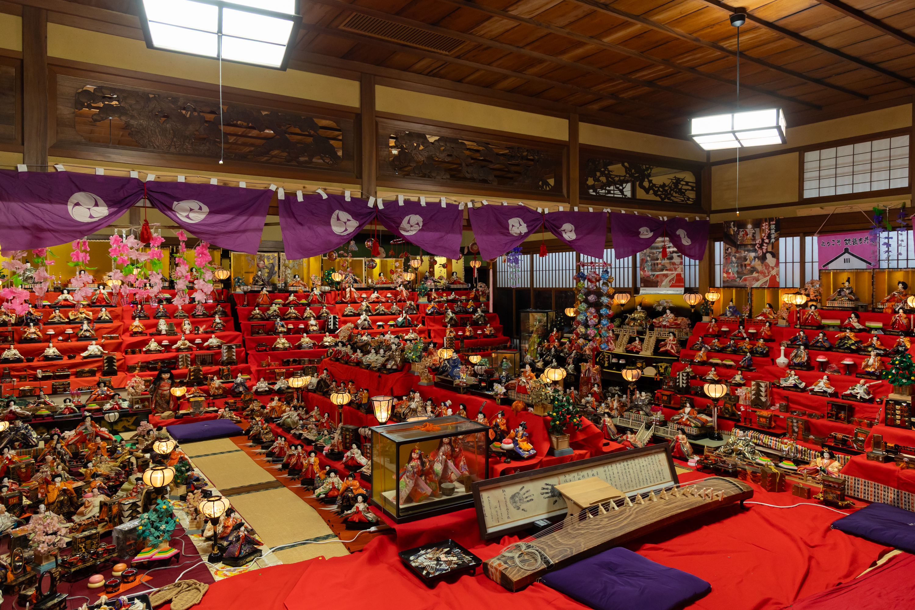 乾物魚類問屋だった大型町家の2階にある30畳の大広間いっぱいに飾られた「座敷雛」は一見の価値あり。飾りは毎年変わるので1階の展示も併せてお楽しみください。期間限定の雛御膳もぜひ。