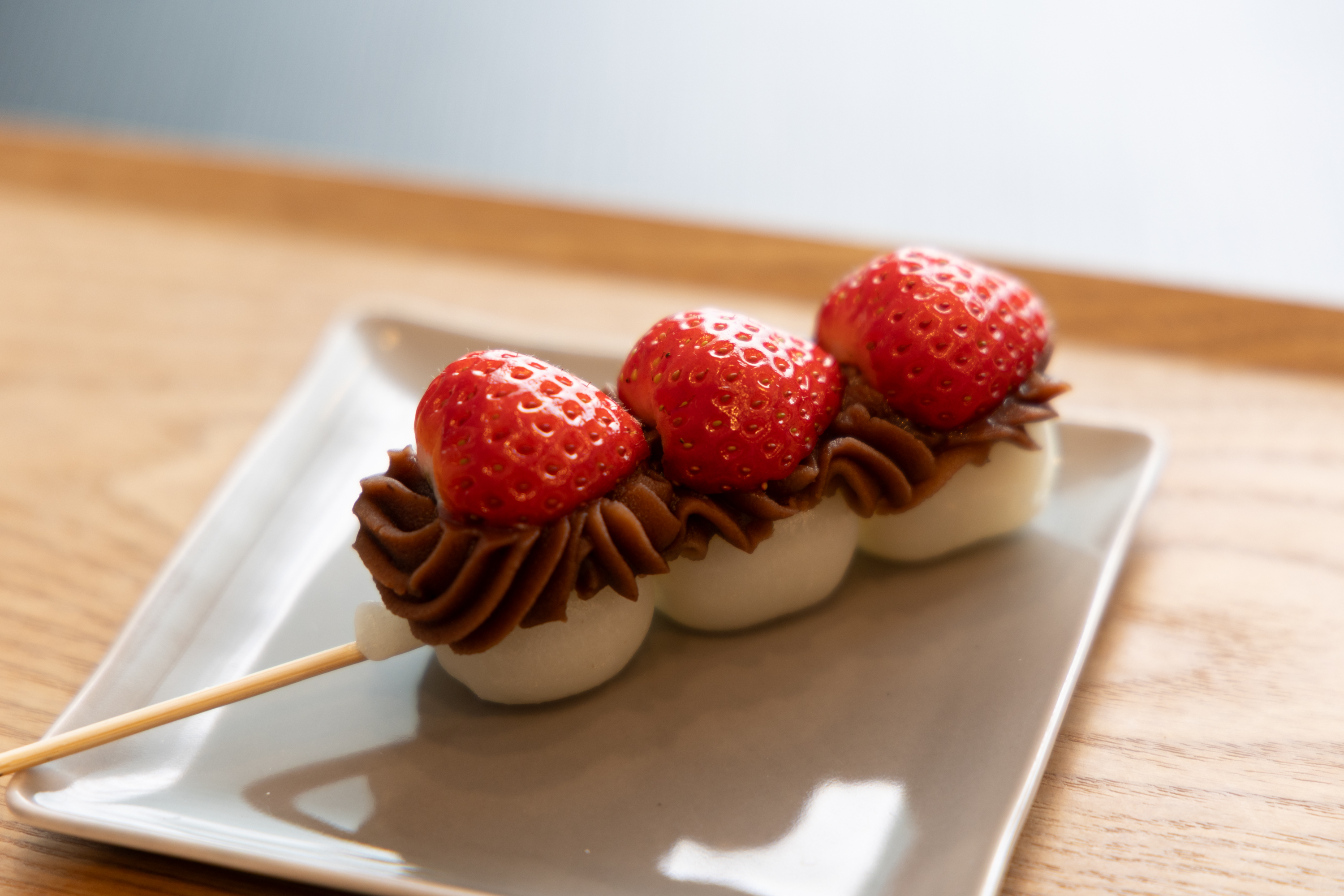 うきはで長年親しまれている「石橋餅加工所」のご夫婦が営まれている創作和菓子のお店「暴食の果実」毎年大人気の「いちご大福」苺の種類はあまおうと日によって変わる品種の2種類があり、それぞれ粒あん、よもぎ、白あん、チョコレートと4種類の味で楽しめます。餅屋さんならではのもち米を蒸し杵で衝き上げた正真正銘の杵搗き餅で、もち米本来の旨みとコシのある歯ごたえの大福餅が甘酸っぱいいちごとあんと合います。糸を引いて半分にすると苺の香りがふわっと香り、一口頬張るとあ〜幸せ。可愛い苺ののった団子もわらび餅ドリンクもおすすめです!
