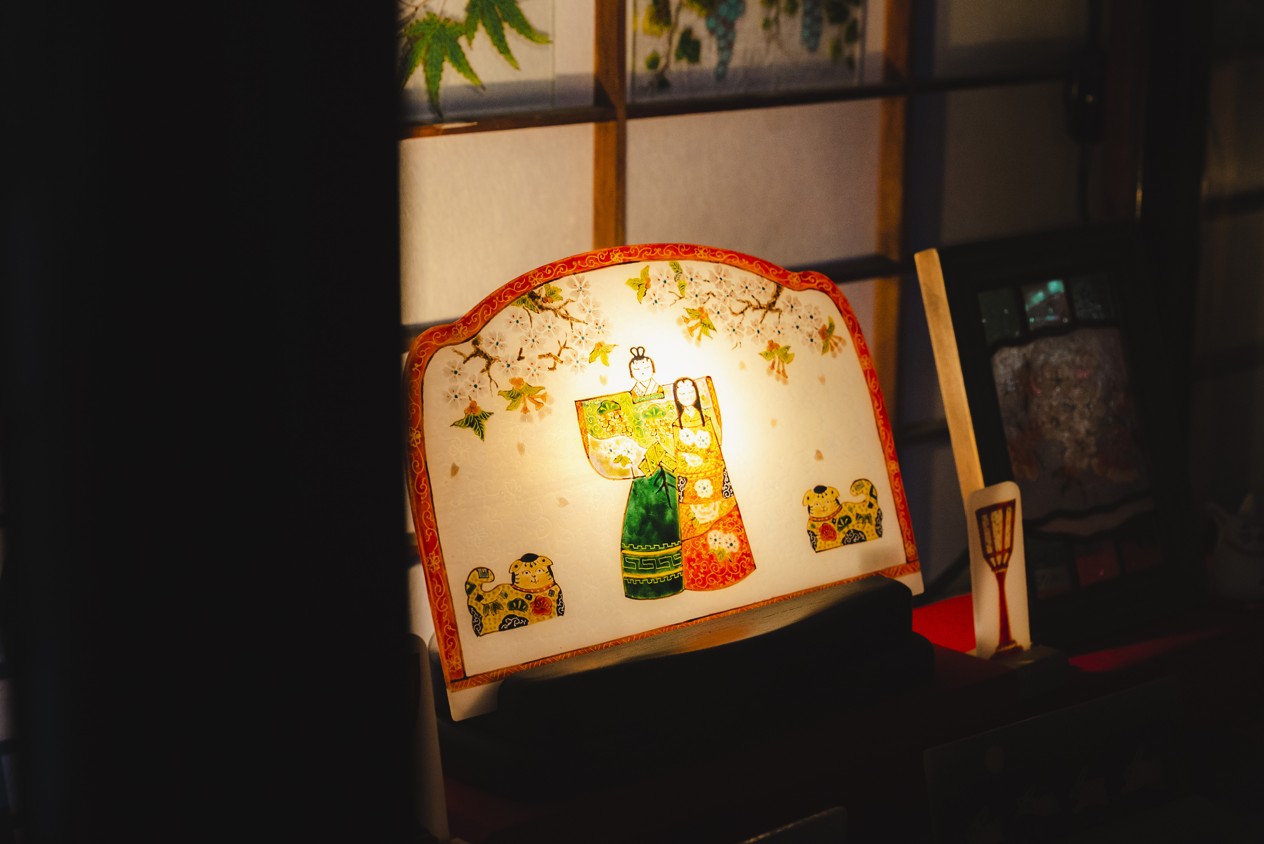 古き町並み残る吉井町。古き良き物の中から見いだす新しさ。和文様の燈具やおひな様をステンドグラスで創作展示されます。梅・桜・お雛様のアクセサリー小物もあります♪