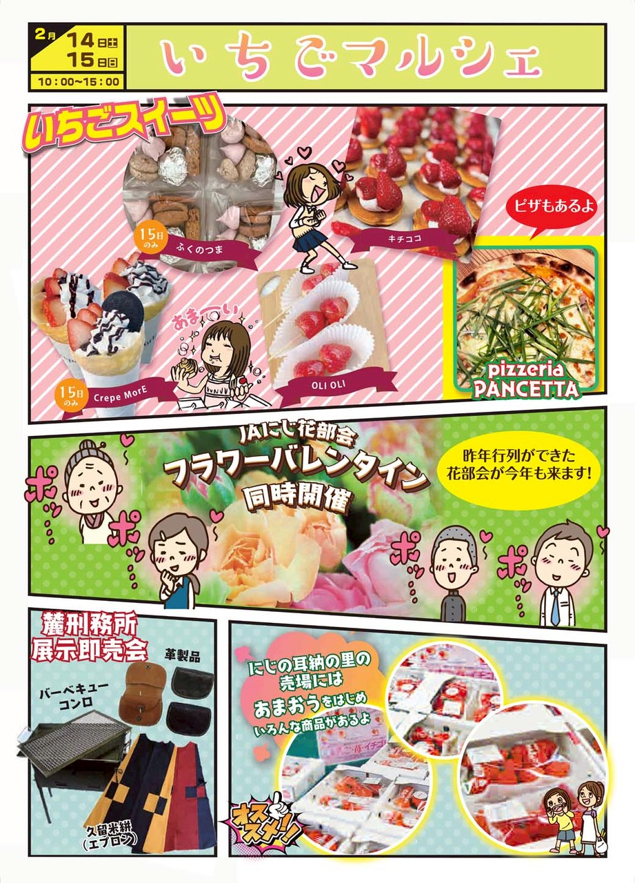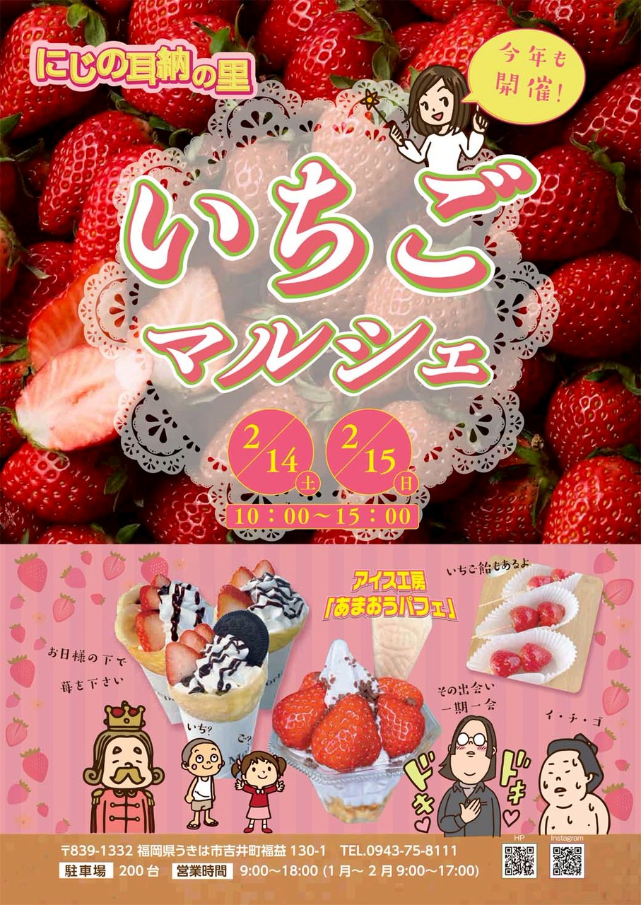にじの耳納の里で「いちごマルシェ」が開催されます。いちごたっぷりのパフェ、クレープ、いちご飴など旬のあまおうを使ったスイーツが大集合!売り場では、あまおうをはじめ旬の商品も並びます。甘い香りに包まれる2日間。いちご好きにはたまらないイベント!ぜひお出かけください♪