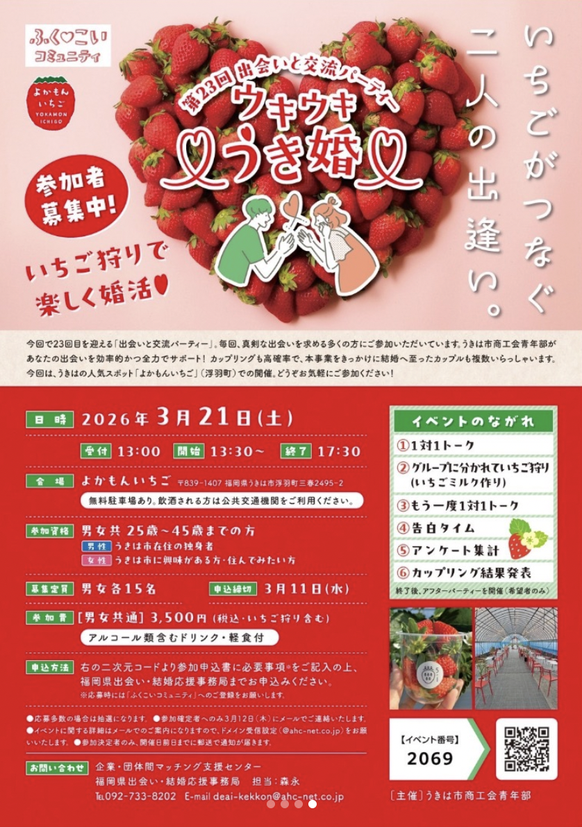 うきは市商工会青年部があなたの出会いを全力でサポート!カップリングも高確率で、本事業をきっかけに結婚へ至ったカップルも複数いらっしゃいます。お気軽にご参加ください♪
