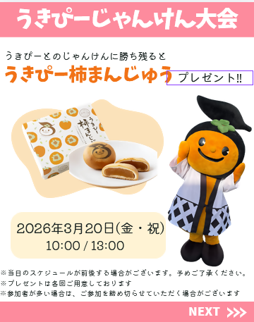 会場では、うきは市のキャラクター「うきぴー」も登場予定!うきぴーまんじゅうプレゼントの「じゃんけん大会」などの楽しいイベントも企画されており、お子さまから大人までお楽しみいただけます。
