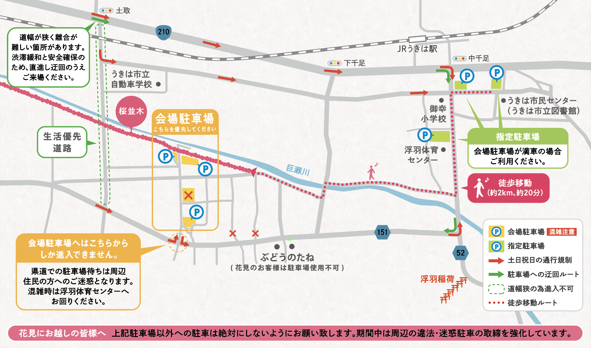 会場の駐車場が満車の場合は、指定の駐車場に駐車していただき、桜並木まで2キロ程度歩いていただくこととなります。皆様には大変ご迷惑をおかけしますが、周辺地域の渋滞緩和と安全確保のため、ご理解とご協力をお願いいたします。